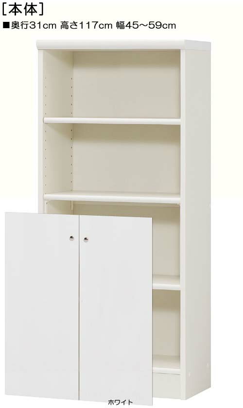 商品仕様 ■タイプ: 扉付 標準棚板(棚板厚さ1.7cm)タイプ 両開き ■棚板耐荷重: 10kg ■外寸: 奥行31cm×高さ117cm×幅45〜59cm (幅は1cm単位でオーダーできます) ■外寸(幅): 45cm 46cm 47cm 48cm 49cm 50cm 51cm 52cm 53cm 54cm 55cm 56cm 57cm 58cm 59cm ■扉高(実寸): 62.6cm ■棚板枚数 移動棚板:2 移動固定棚板:1 共通仕様 ■材質: プリント化粧繊維板 ■塗装: ウレタン樹脂塗装 ■素材: ホルムアルデヒドの発生を最小限に抑えた基材・芯材・プリント紙・接着剤(F☆