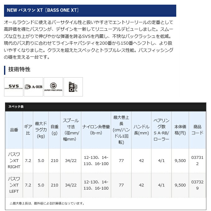 メーカー希望小売価格はメーカーサイトに基づいて掲載しています 20161226-02メーカー名 シマノ / SHIMANO 商品名 バスワン XT[BASS ONE XT] (2017年モデル) 商品情報 人気のバスワンがデザインを一新。